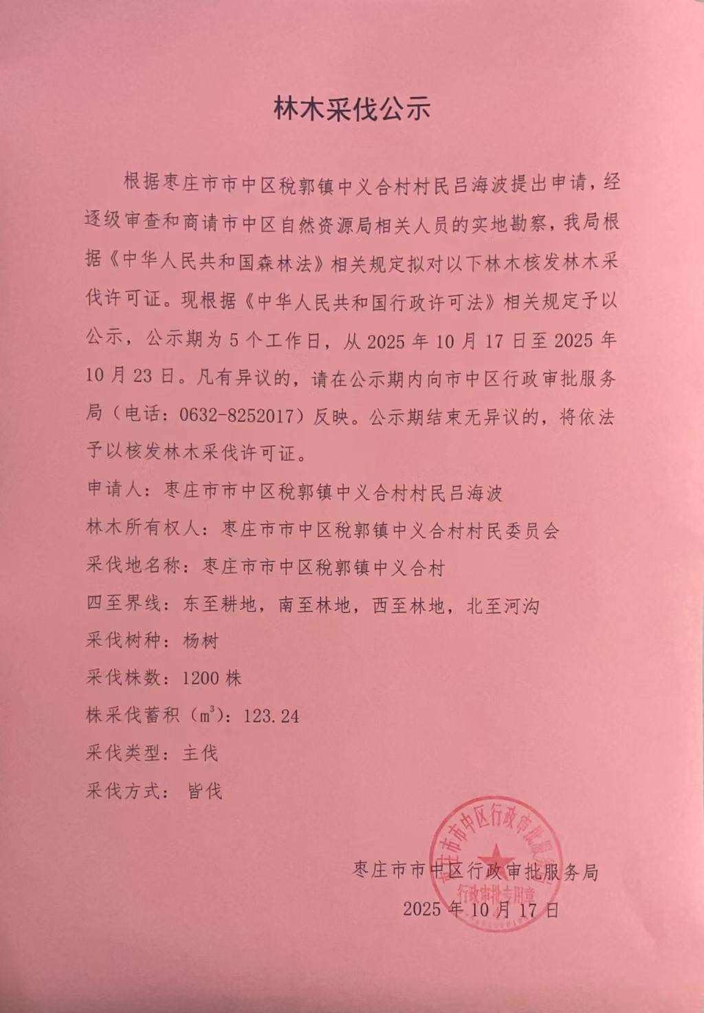 市中区行政审批服务局关于税郭镇中义合村村民吕海波林木采伐公示