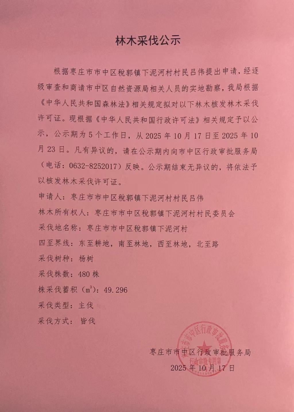 市中区行政审批服务局关于税郭镇下泥河村村民吕伟林木采伐公示