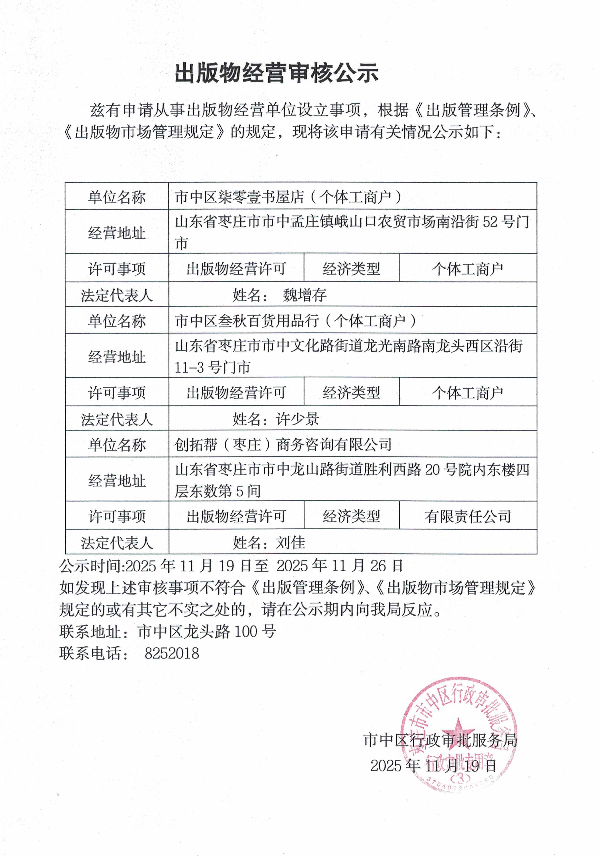 市中区行政审批服务局关于《出版物经营审核》的公示