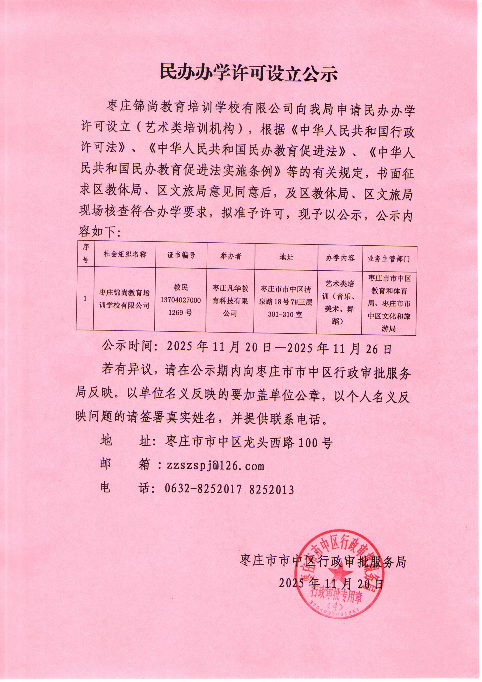 • 标  题:市中区行政审批服务局关于民办办学许可设立的公示