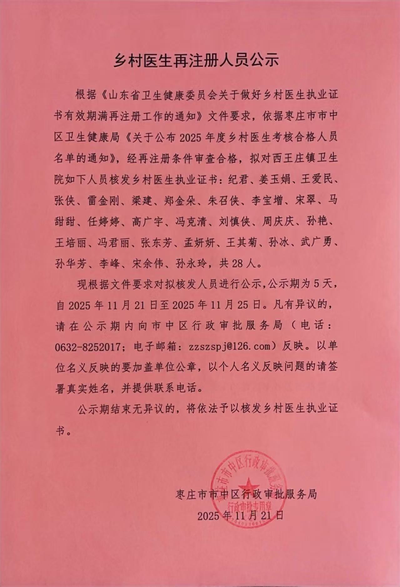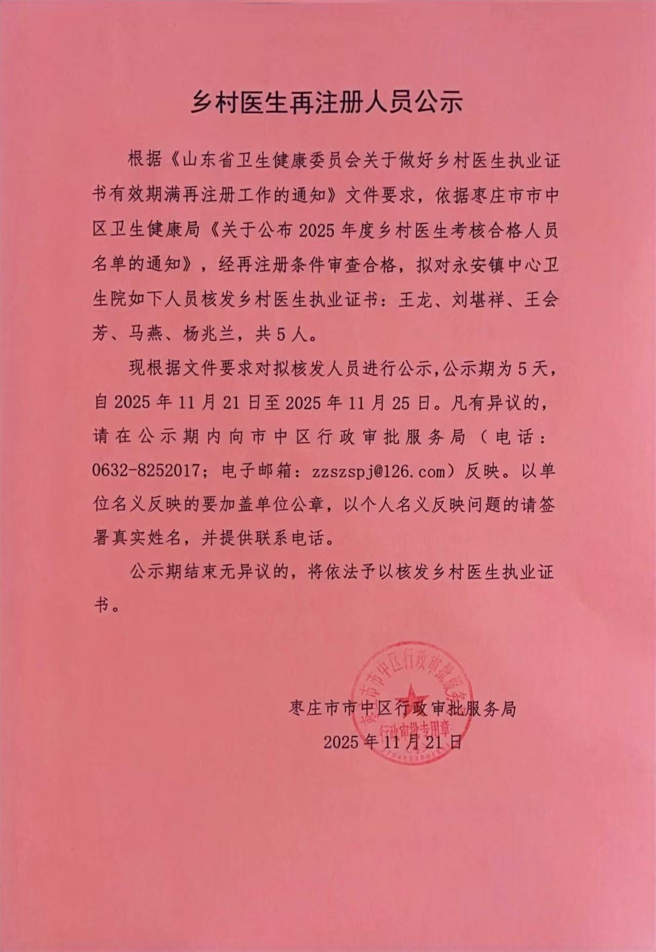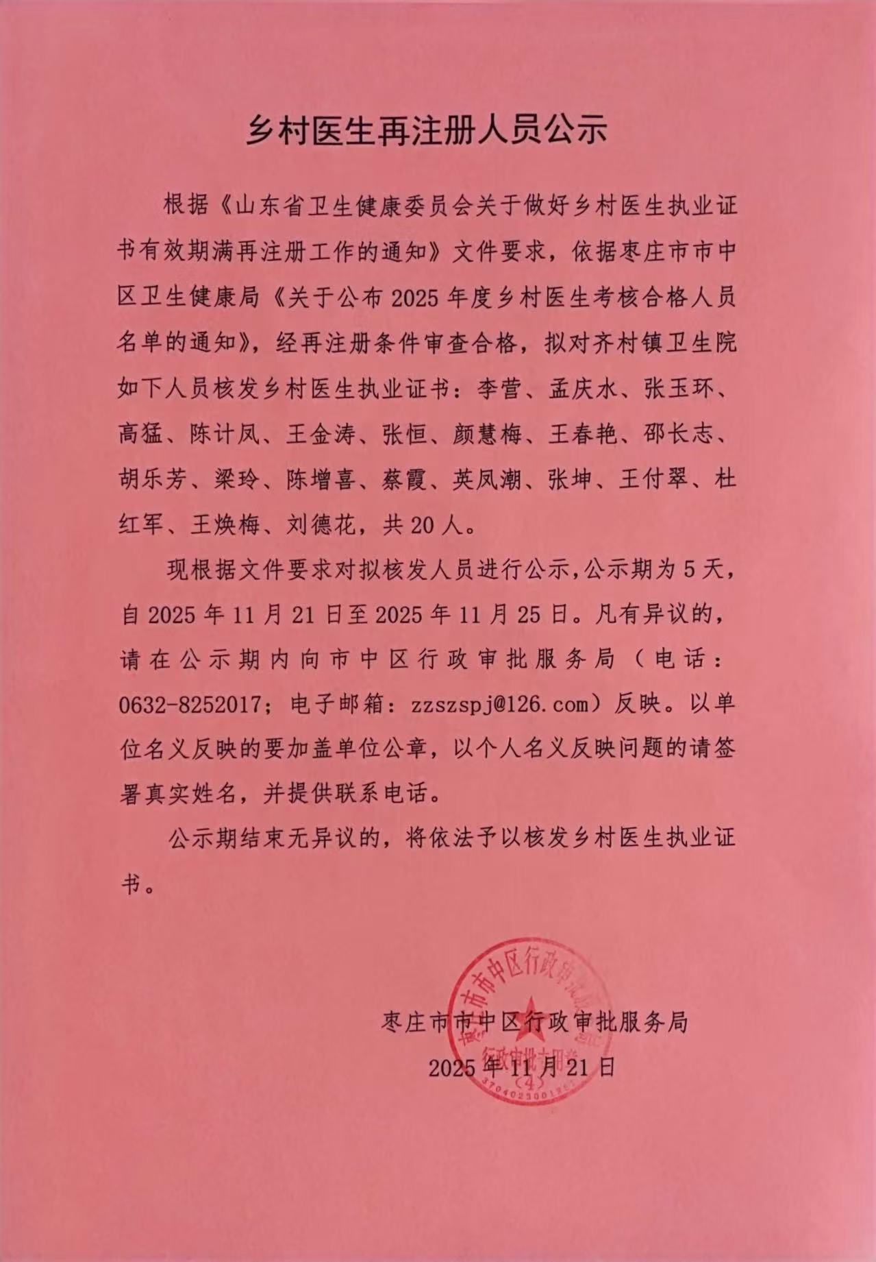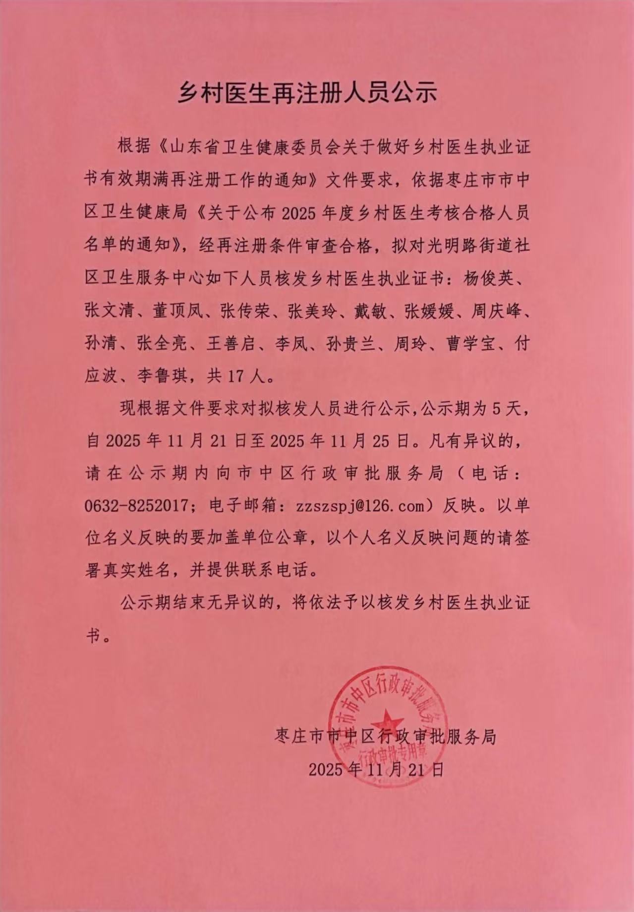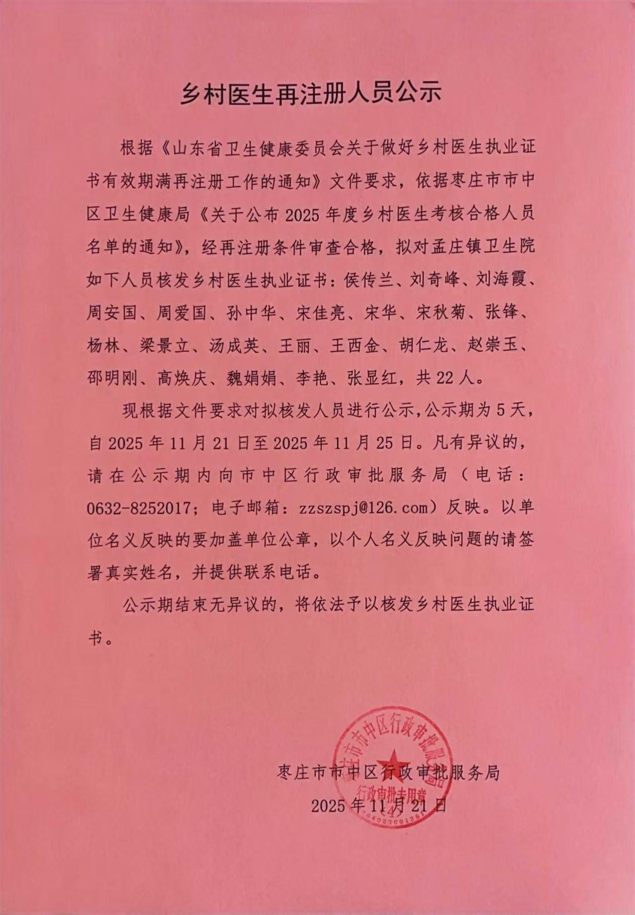 市中区行政审批服务局关于乡村医生再注册人员公示