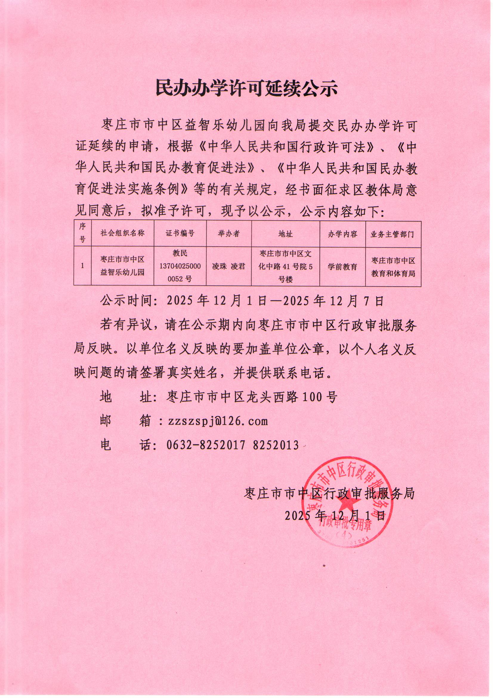 市中区行政审批服务局关于民办办学许可延续的公示