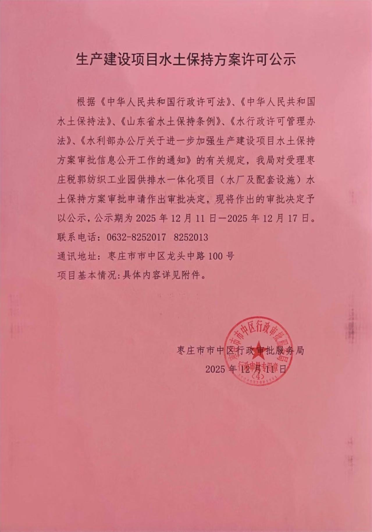 关于枣庄税郭纺织工业园供排水一体化项目(水厂及配套设施)水土保持方案准予许可决定书.pdf