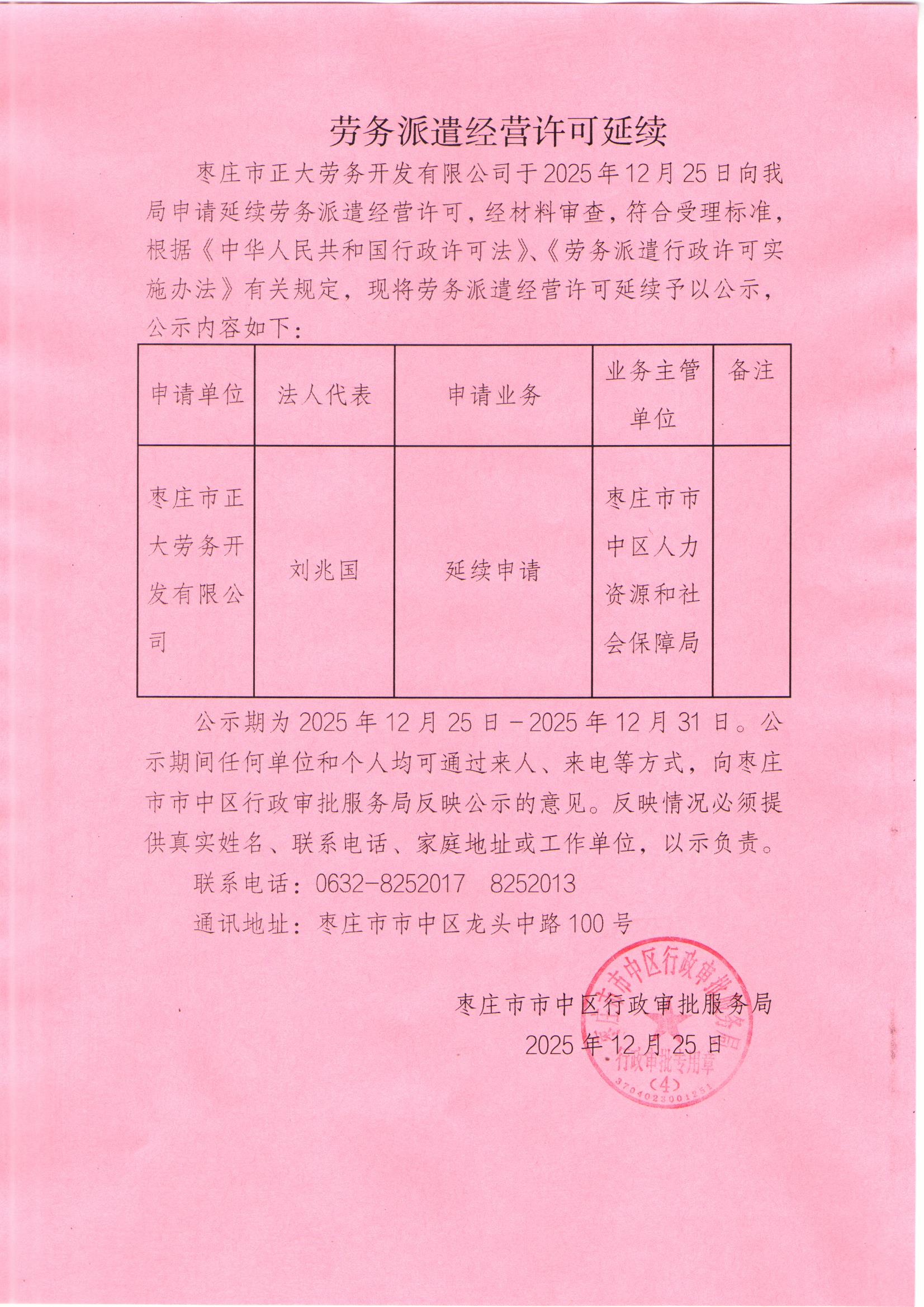 市中区行政审批服务局关于劳务派遣经营许可延续