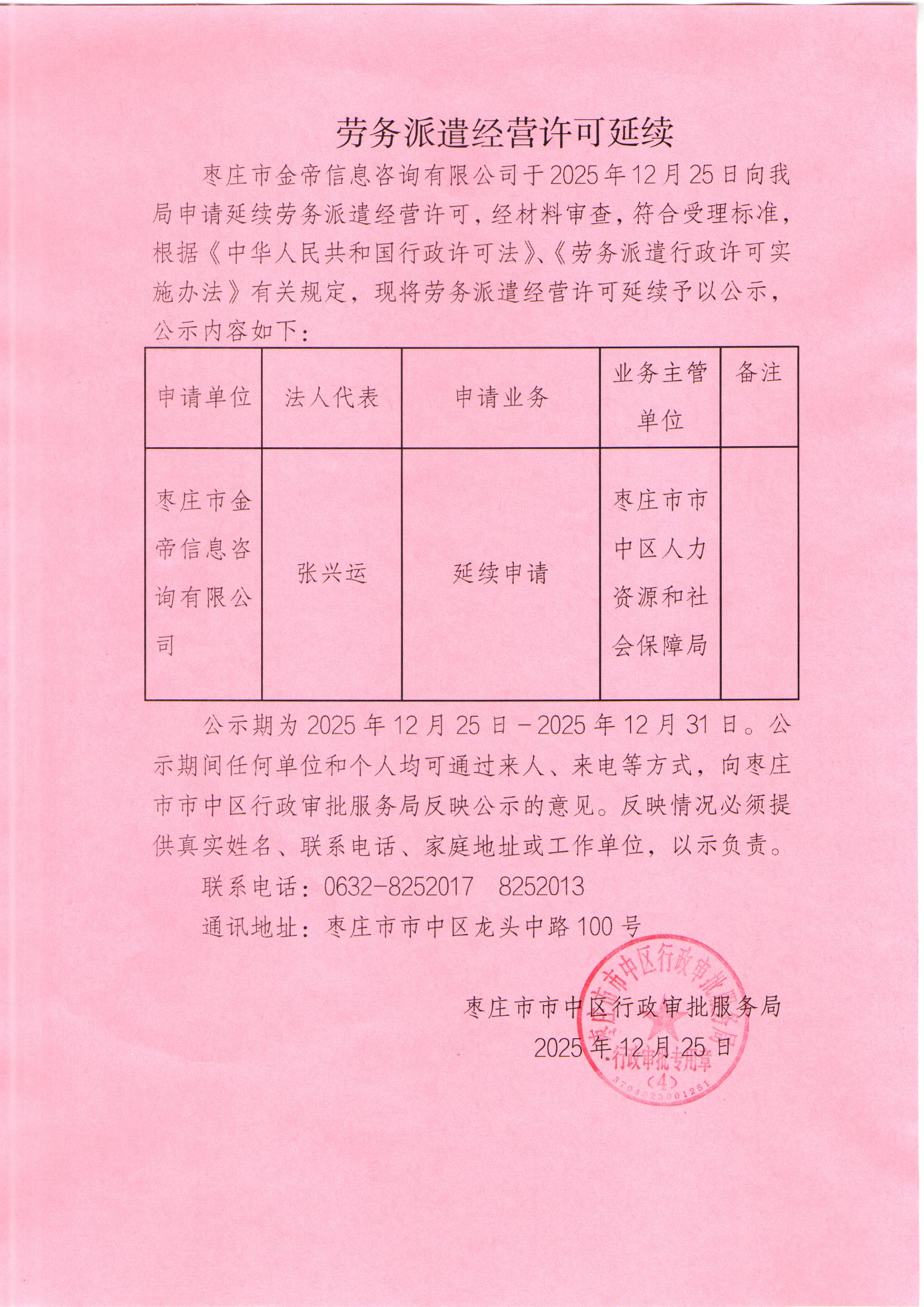市中区行政审批服务局关于劳务派遣经营许可延续