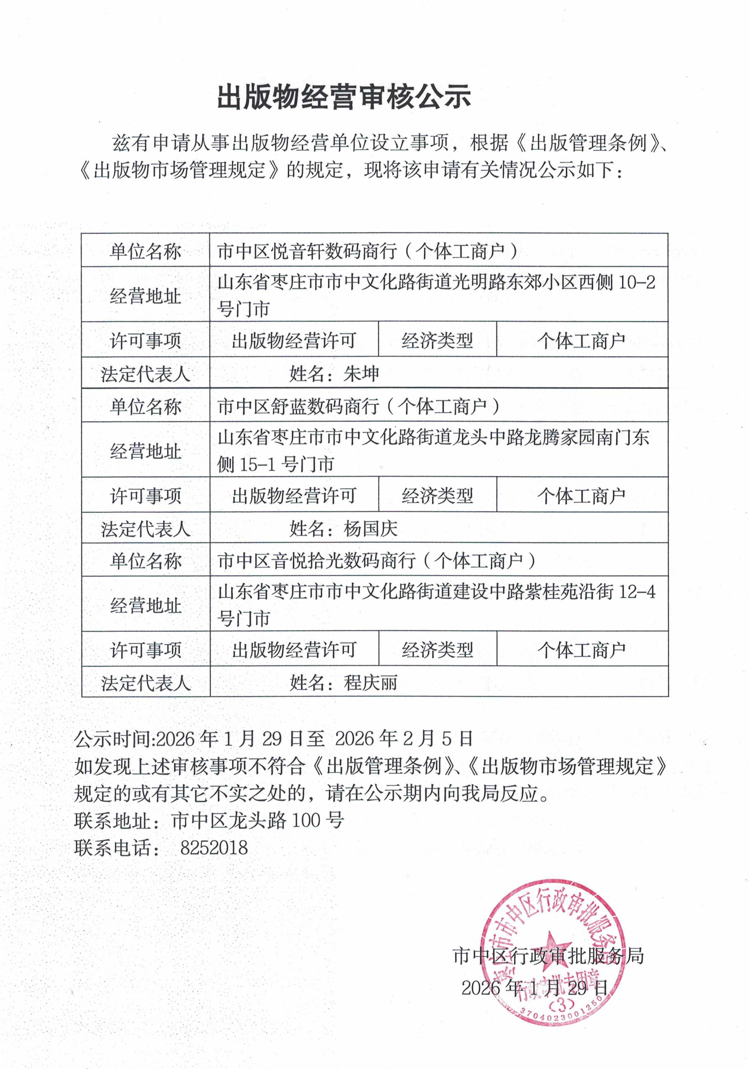 • 标  题:市中区行政审批服务局关于《出版物经营审核》的公示