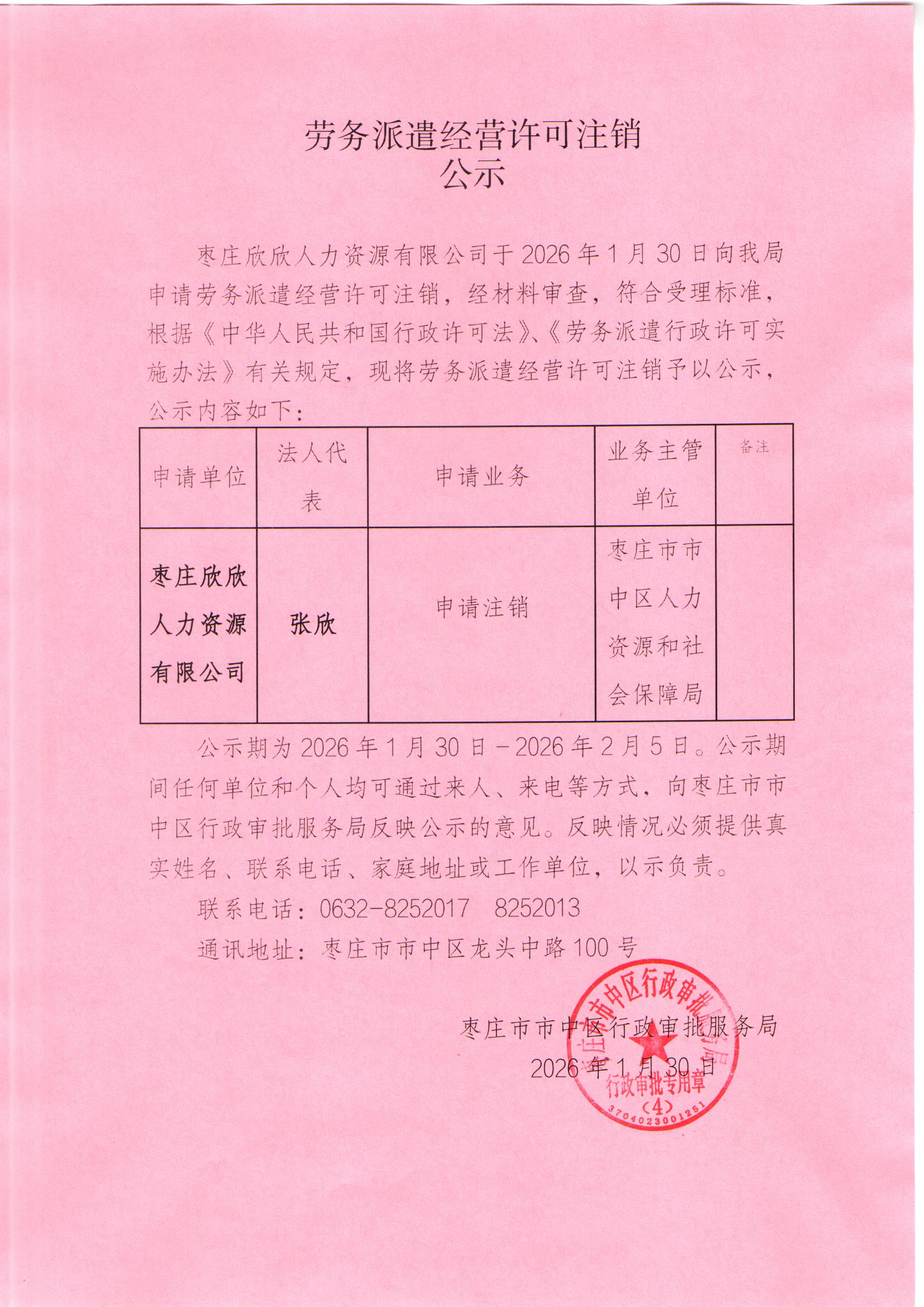 • 标  题:市中区行政审批服务局关于劳务派遣经营许可注销公示