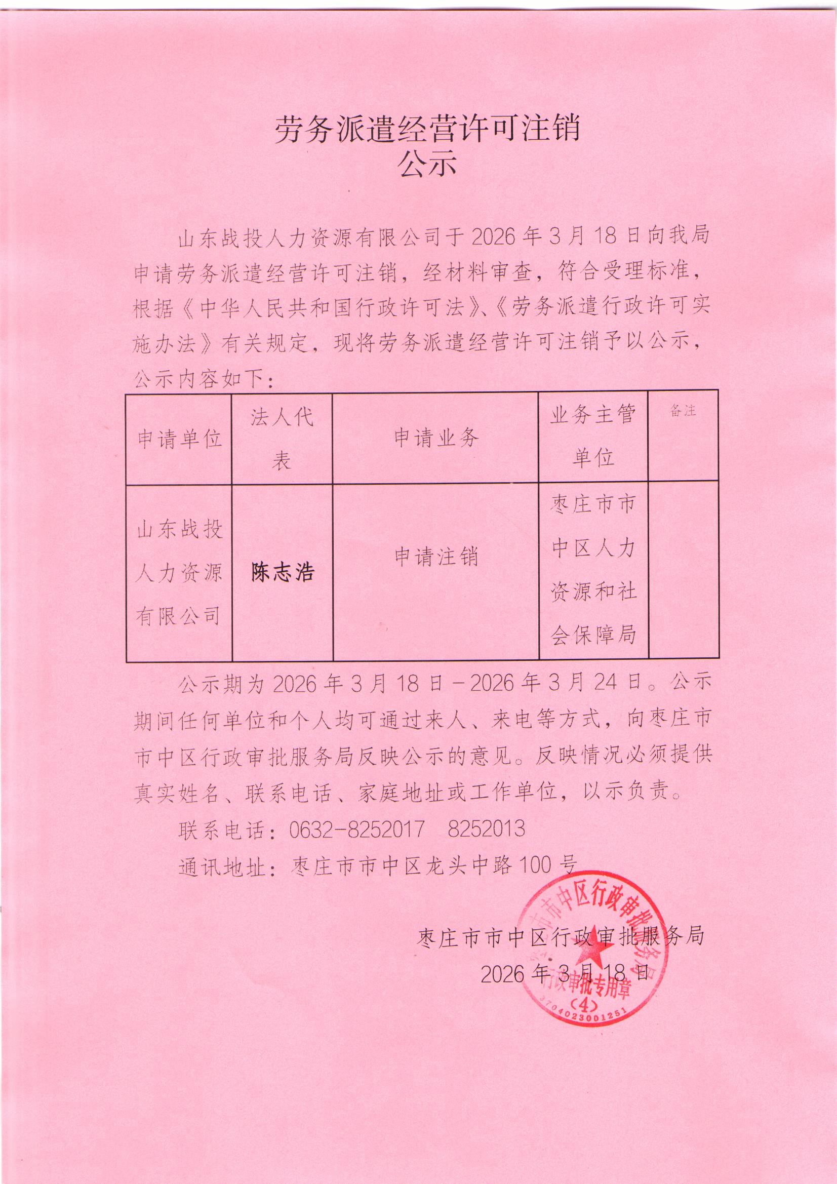 • 标  题:市中区行政审批服务局关于劳务派遣经营许可注销公示