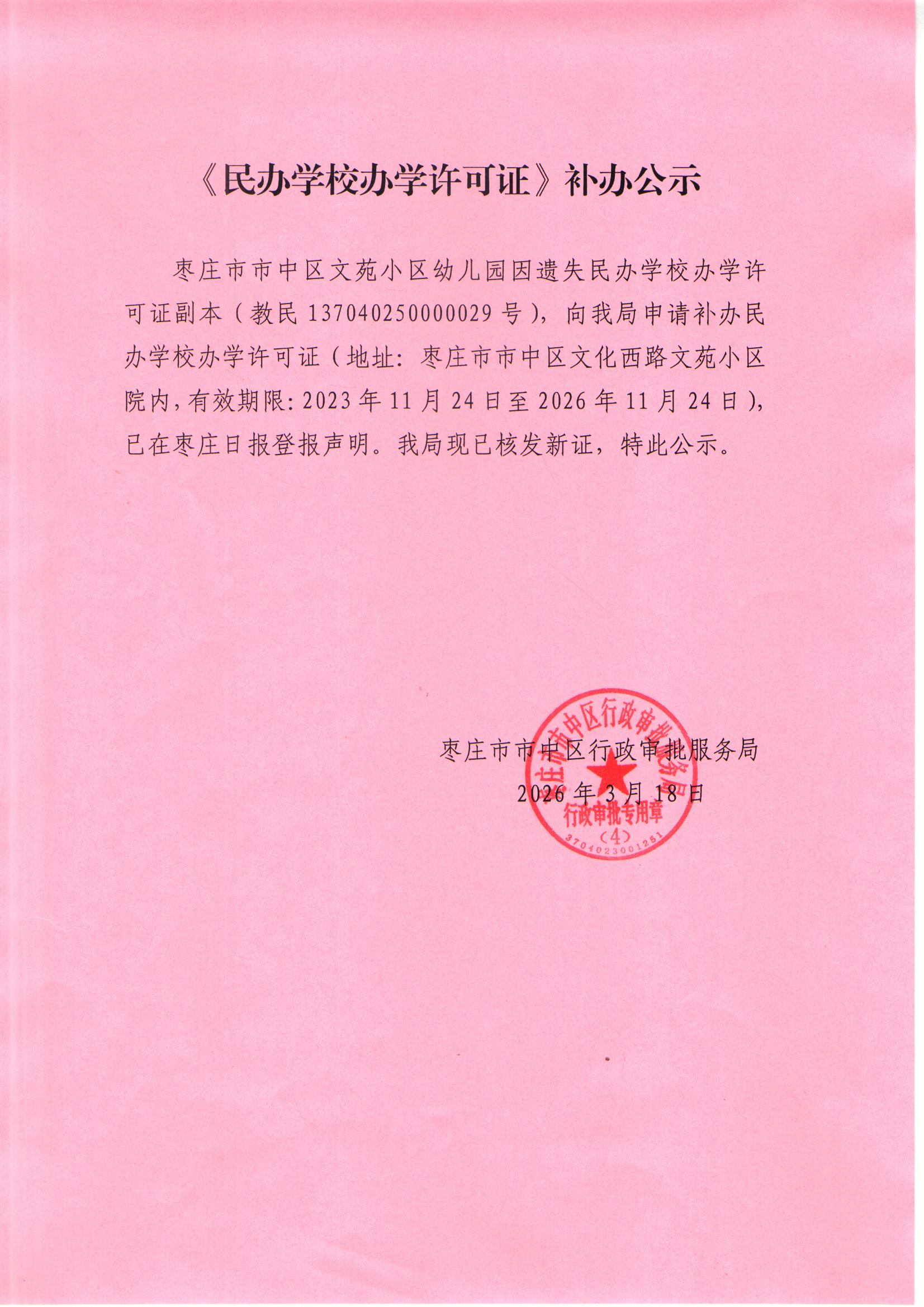 市中区行政审批服务局关于《民办学校办学许可证》补办公示