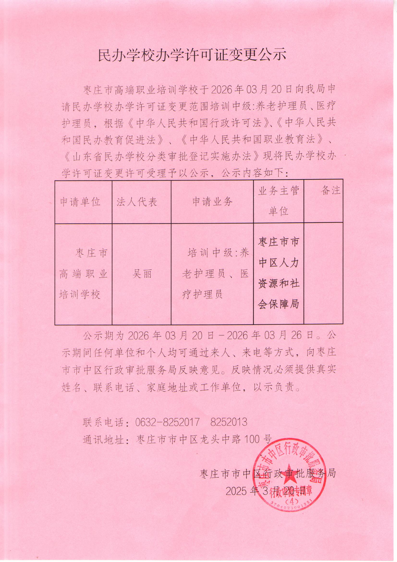 市中区行政审批服务局关于民办学校办学许可证变更公示