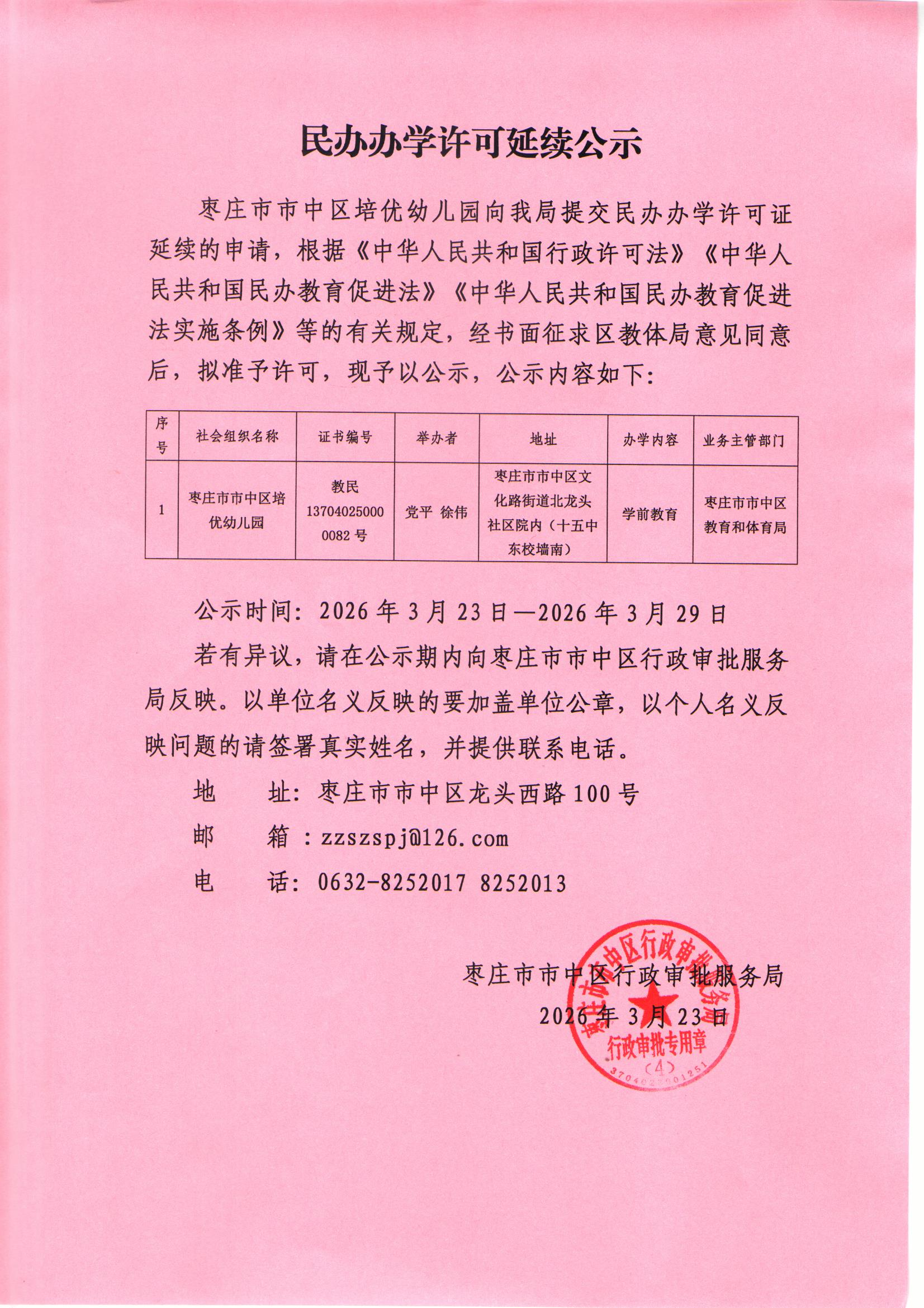 市中区行政审批服务局关于民办学校办学许可证延续的公示