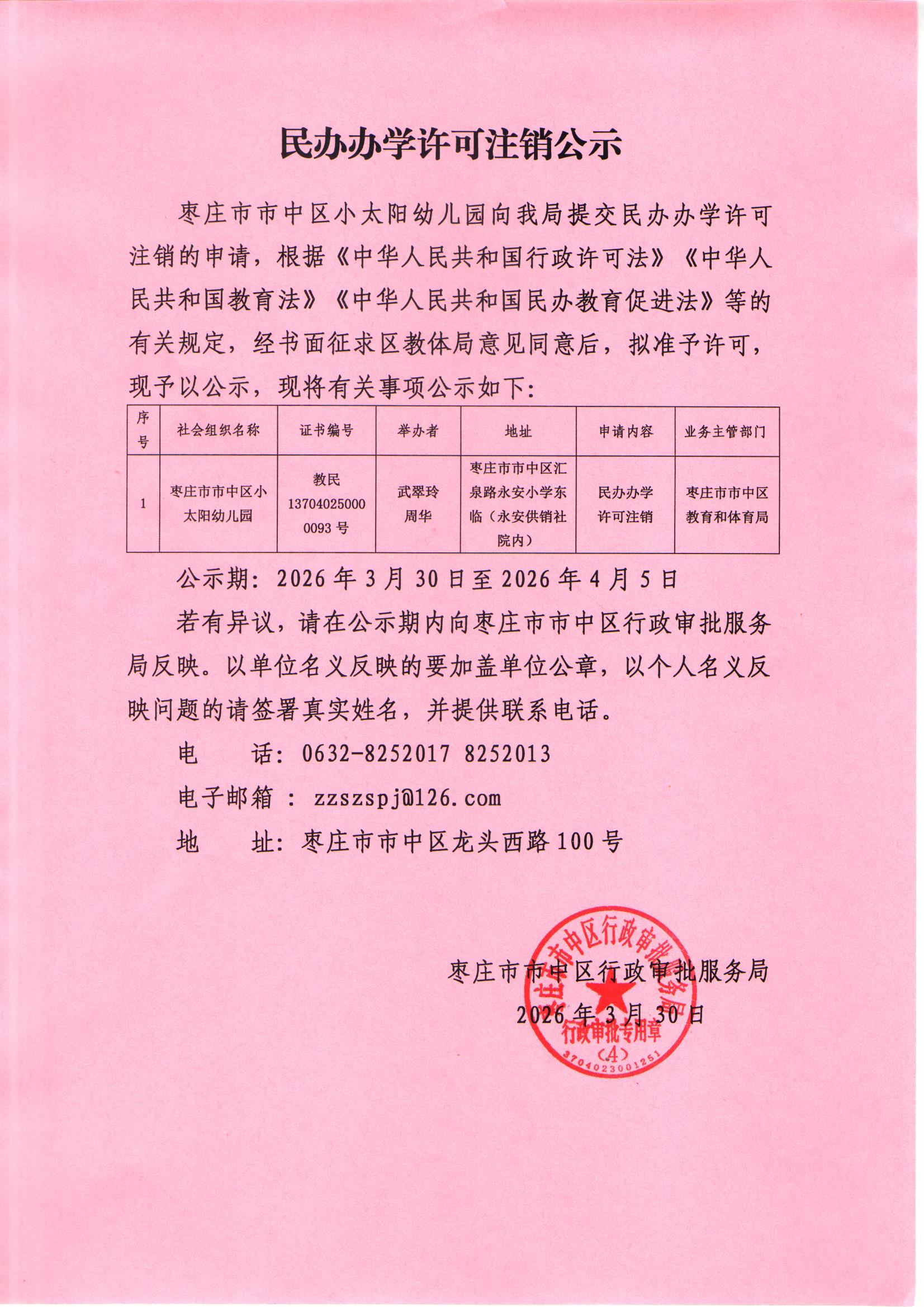 市中区行政审批服务局关于民办学校办学许可证注销的公示