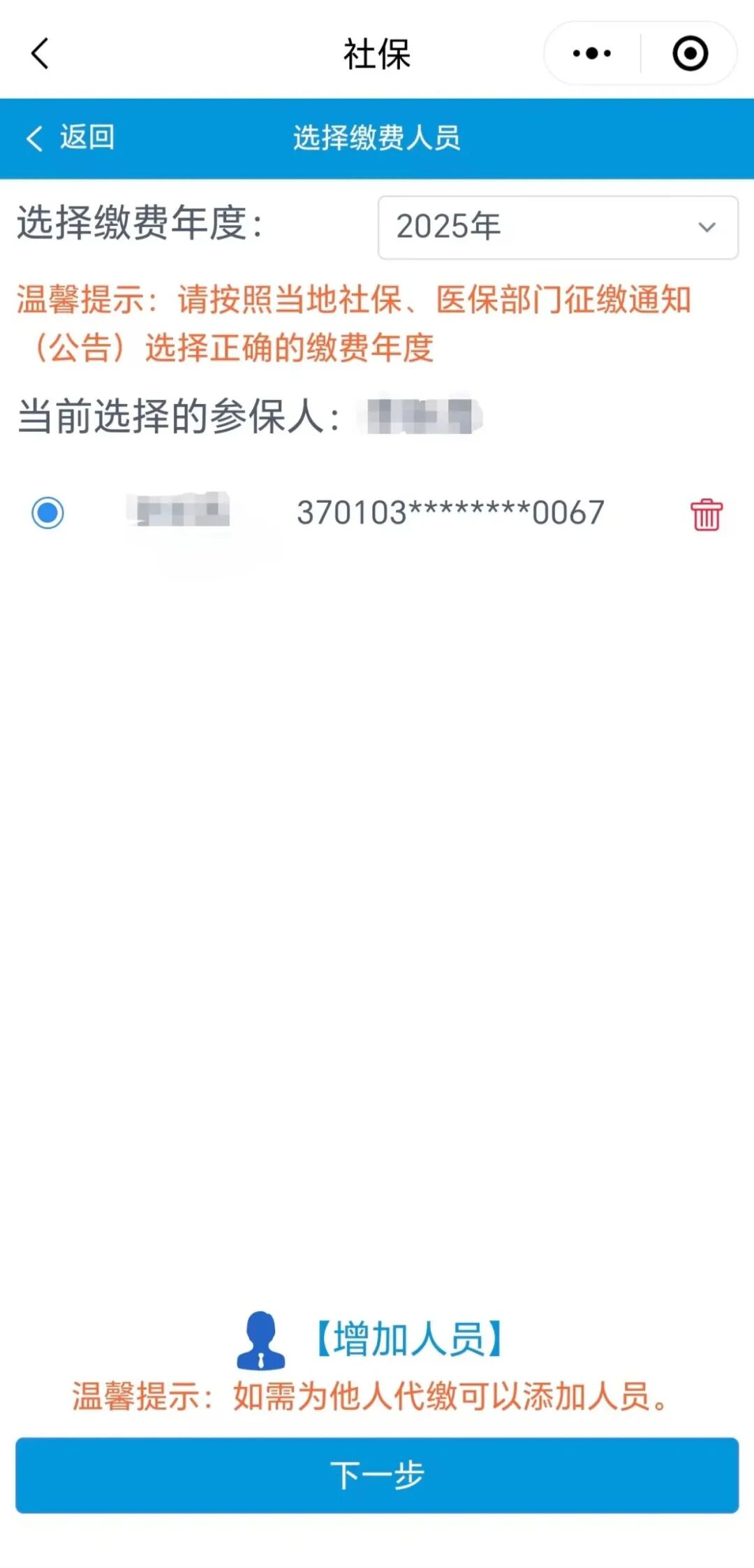 选择缴费年度、参保人,如需为他人代缴可输入相关信息增加人员,选择缴费年度、需缴费的人员,点击“下一步”