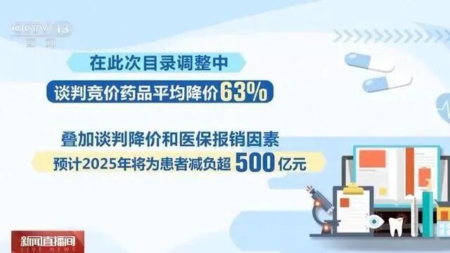 在此次目录调整中,谈判竞价药品平均降价63%。叠加谈判降价和医保报销因素,预计2025年将为患者减负超500亿元。