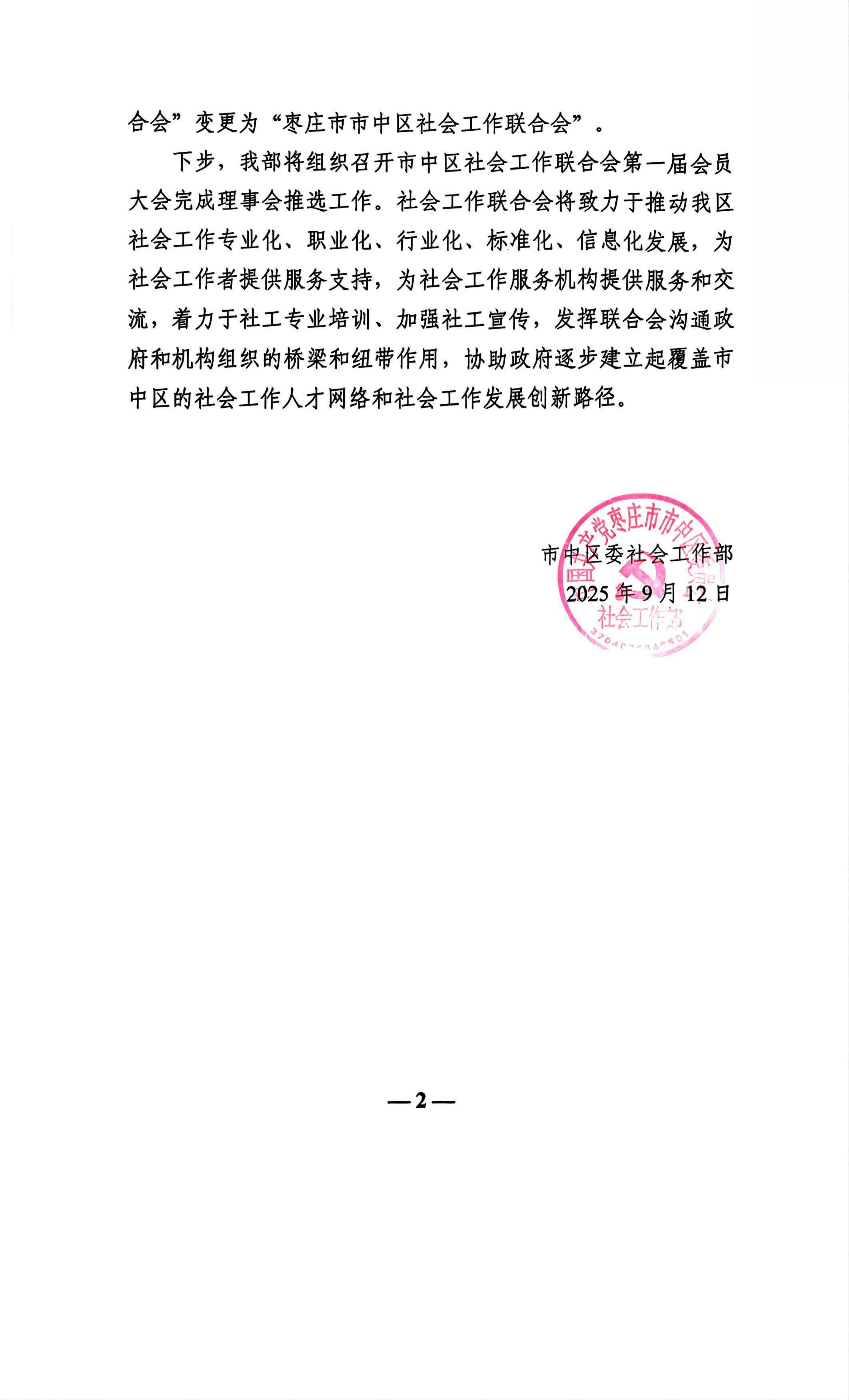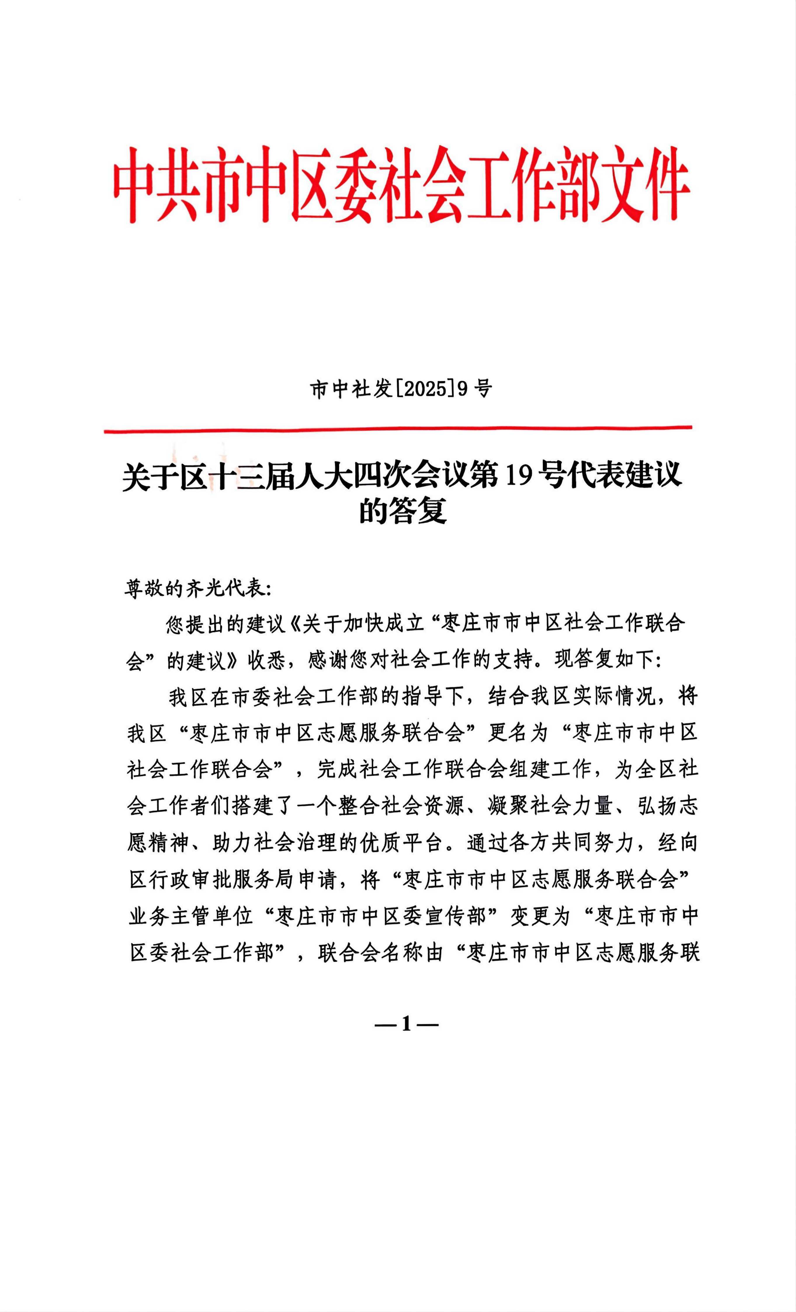 2025年度市中区委社会工作部关于区十三届人大四次会议第19号代表建议的答复(关于加快成立“枣庄市市中区社会工作联合会”的建议)
