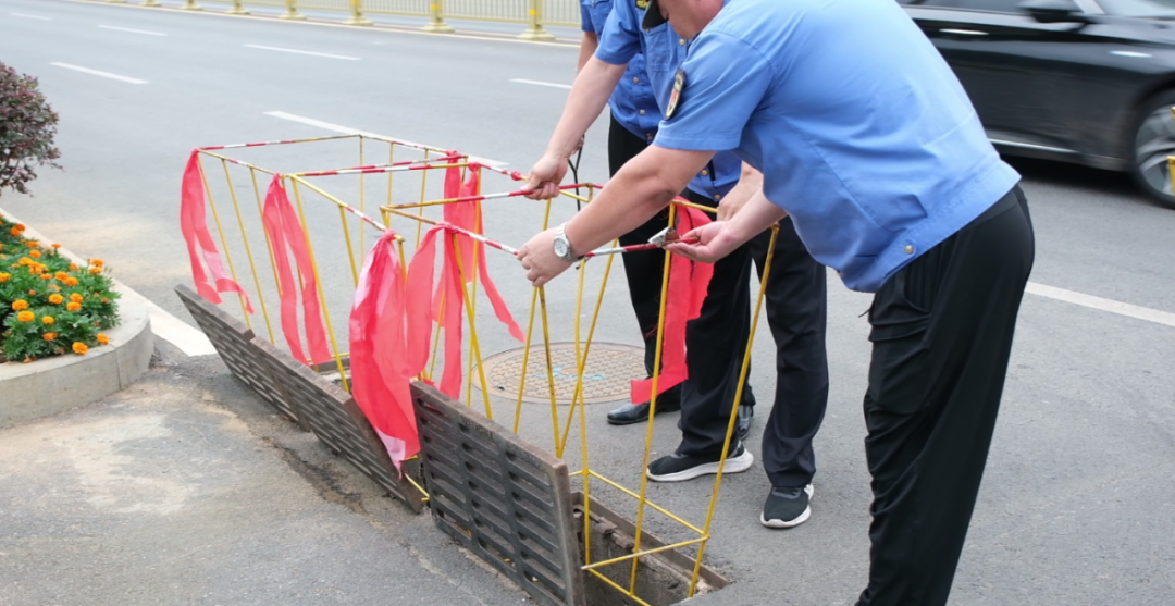 7月15日下午,记者来到文化西路易涝点,看到执法人员正在排水处架设警示钢笼。