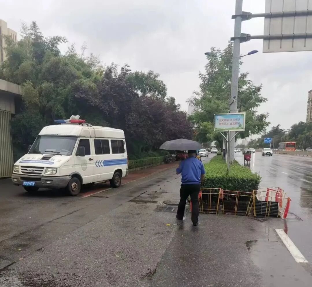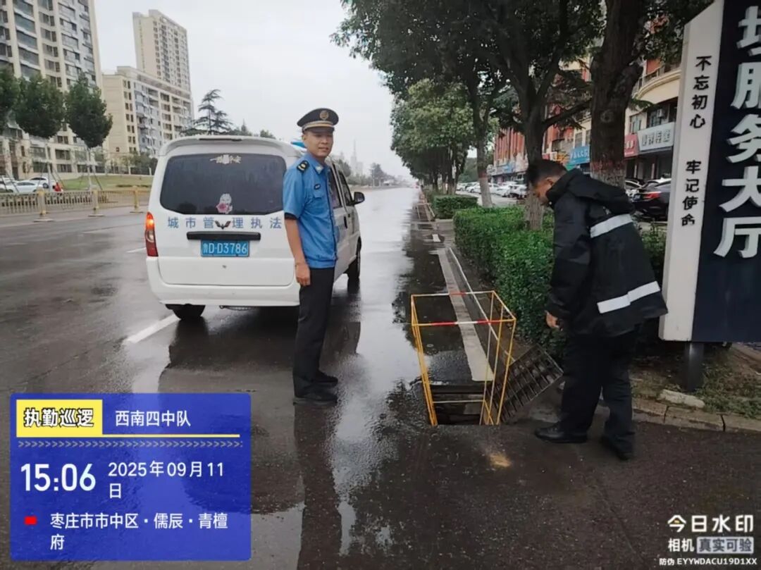 防汛现场,城管队员迅速采取应急措施,针对积水严重区域,规范设置警戒、警示牌,及时打开井盖、雨篦,清理堵塞物,确保排水通畅。同时,全员做好现场值守,对过往行人及车辆进行劝返,避免发生安全事故。