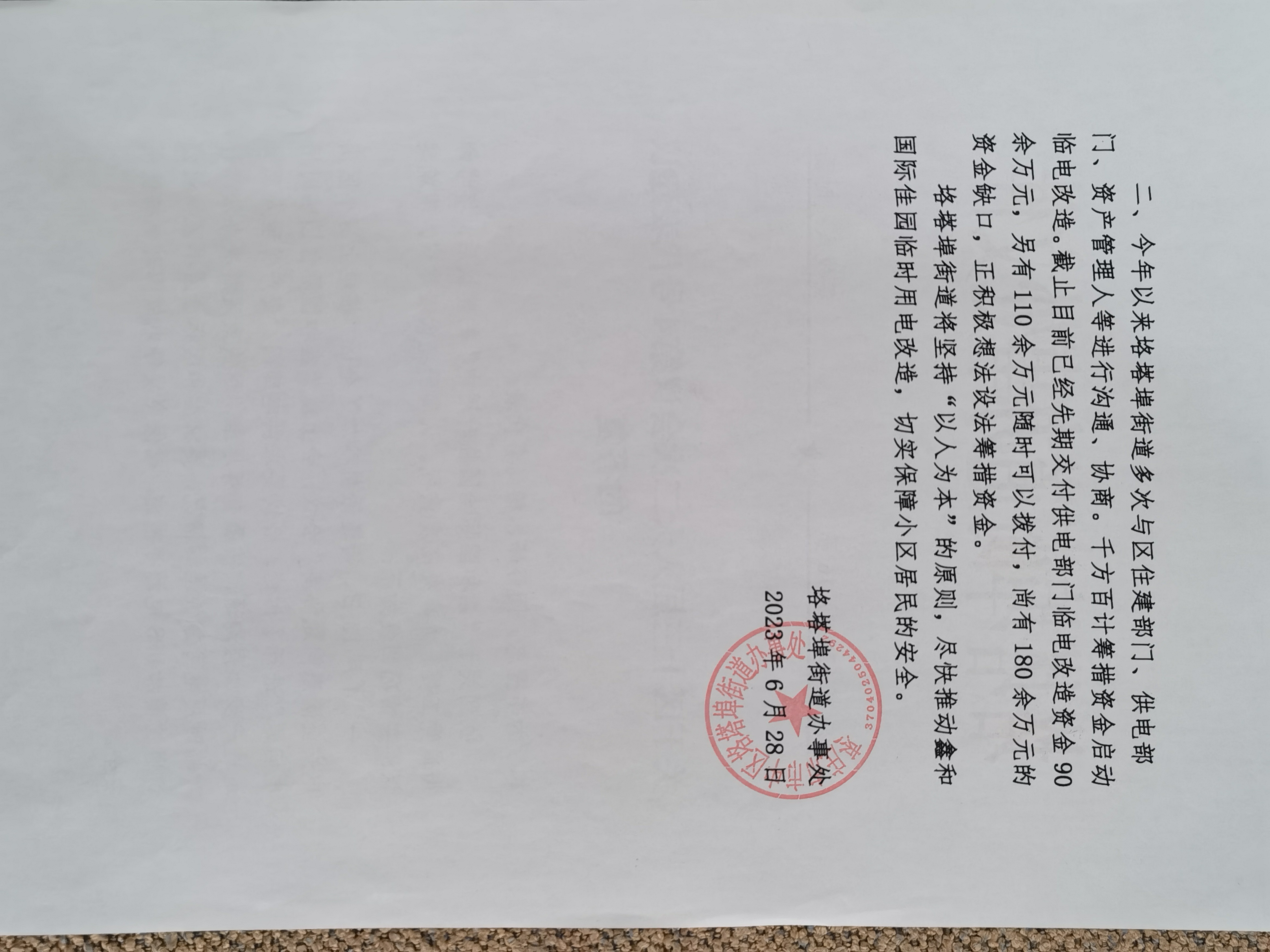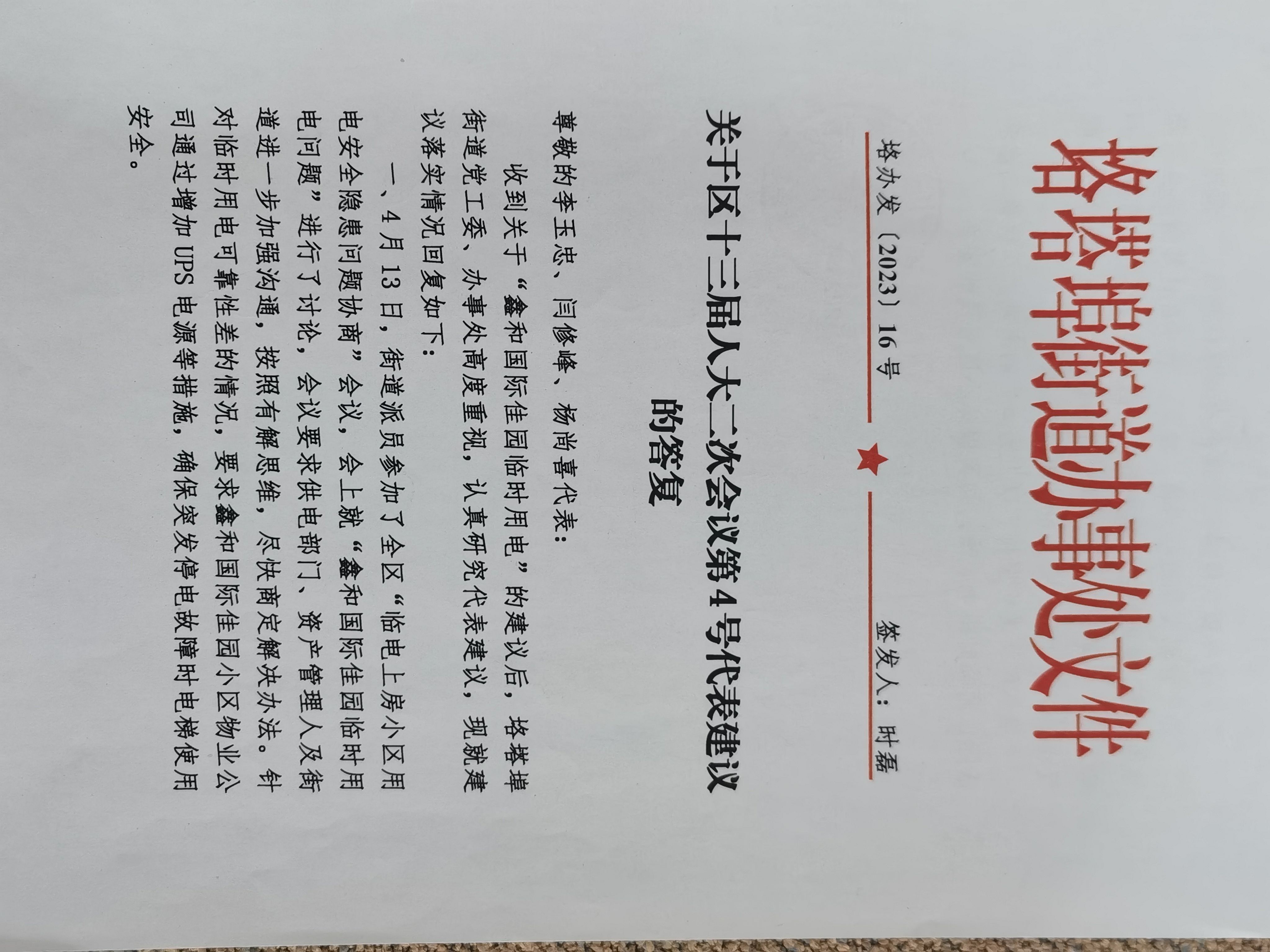 2023年度市中区垎塔埠街道关于区十三届人大二次会议第4号代表建议答复(关于鑫和国际佳园临时用电的建议)