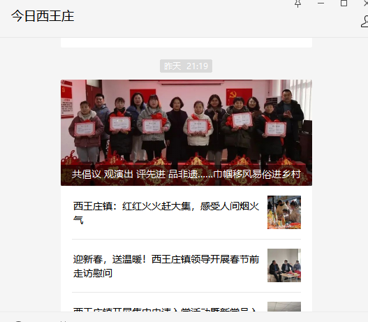 西王庄镇依托政务新媒体“今日西王庄微信公众号”以及部门工作周报,及时调整完善信息公开内容,深入推进政务公开工作,按时公开政府工作动态,努力让群众知情让公众满意。