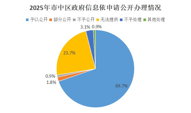 1.依申请公开情况:在依申请公开办理方面,坚持依法合规,规范答复流程,开展专题研判,落实法定时限。2025年,全区新收政府信息公开申请226件,上年度结转申请3件,结转下年度继续办理1件,全年实际办理政府信息公开申请228件(其中予以公开159件,部分公开4件,不予公开2件,无法提供54件,不予处理7件,其他处理2件),均在法定期限内予以答复。