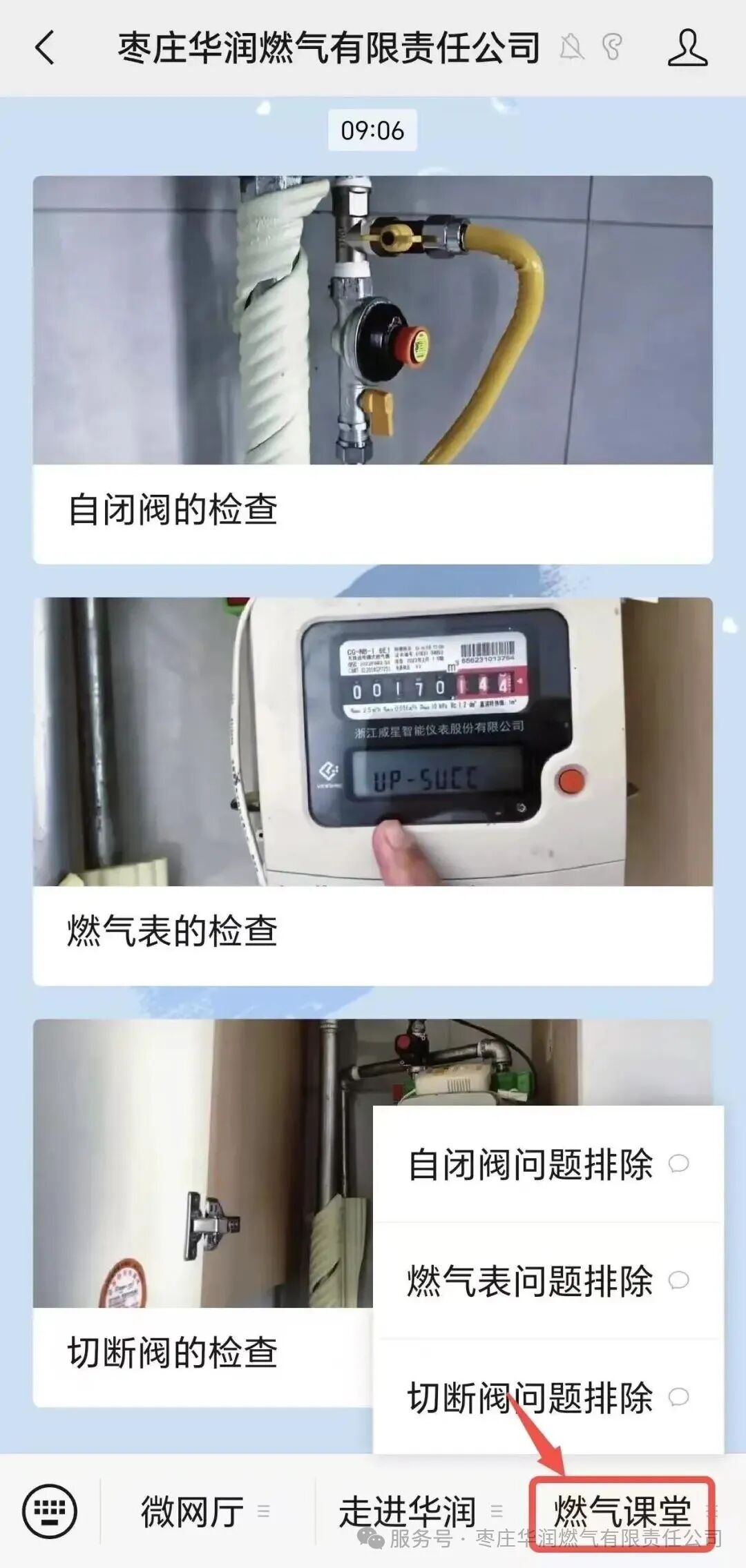 在公众号界面右下角点击“燃气课堂”进入。该板块按问题类型分类,可根据视频指导恢复用气。