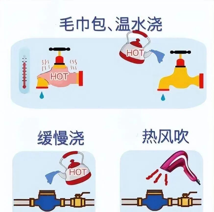 气温低于零摄氏度时,关闭邻近用水设施的窗户(特别是北侧的门窗)及管道井门,保证室内的温度高于零度。