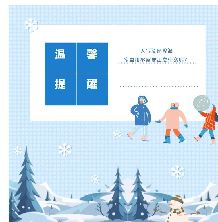 在严寒天气(0℃以下)最好在晚间用水后稍稍拧开水龙头使水流成线,保证水管内自来水流动来防止夜间受冻。同时晚上应做好贮水准备,最好是热水,以避免造成次日生活不便。