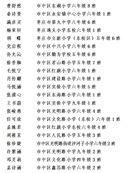 为深入学习贯彻习近平文化思想和习近平总书记关于未成年人思想道德建设的重要论述,落实立德树人根本任务,培育和践行社会主义核心价值观,区文明办、区关工委、团区委、区妇联、区教体局等5部门联合组织开展了2025年度市中区“新时代好少年”宣传学习活动。经广泛发动、组织推荐、审核遴选、联合评议等程序,评选出21位在勤学创新、孝老爱亲、热心公益、传承文化、自强自立等方面表现突出的新时代好少年,现将名单公布如下。