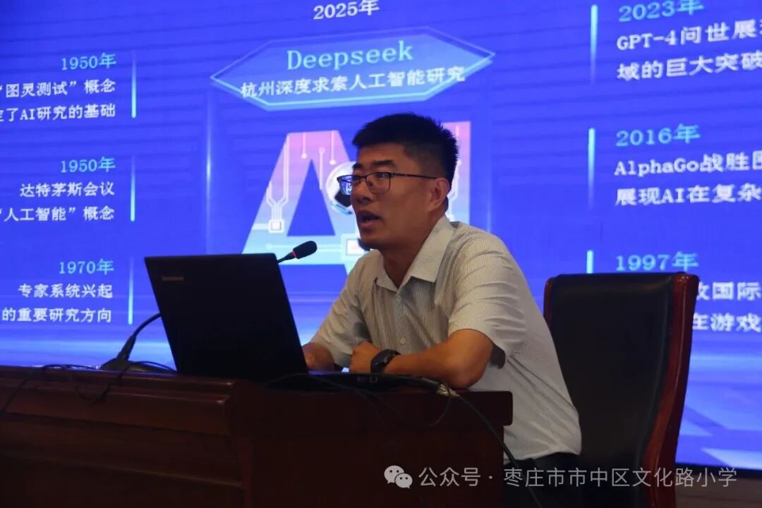 下午,文化路小学东校办公室主任张涛进行AI赋能教学培训。对AI进行了简要介绍,阐述了如何利用AI赋能教学流程。