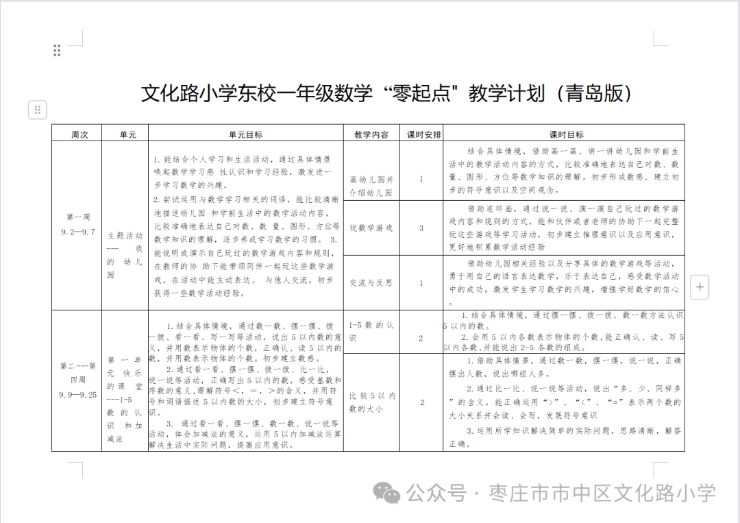 【教学信息】文化路小学东校一年级数学“零起点”教学计划(青岛版)