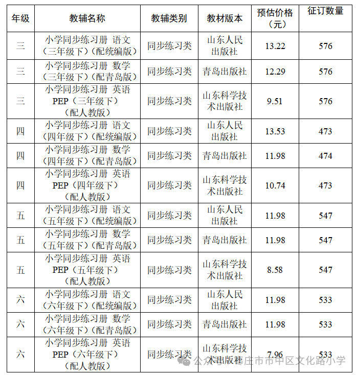 【教材教辅】文化路小学2026年春季教辅资料征订结果