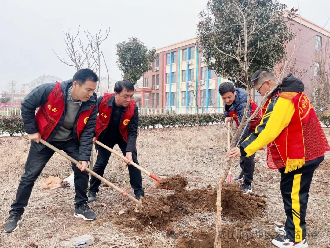 植树现场,党员老师们手持植树工具,干劲十足地投入到植树劳动中。他们一边劳作,一边向身边的少先队员讲解树木对于生态环境的重要意义,用实际行动为同学们上了一堂生动的环保教育课。