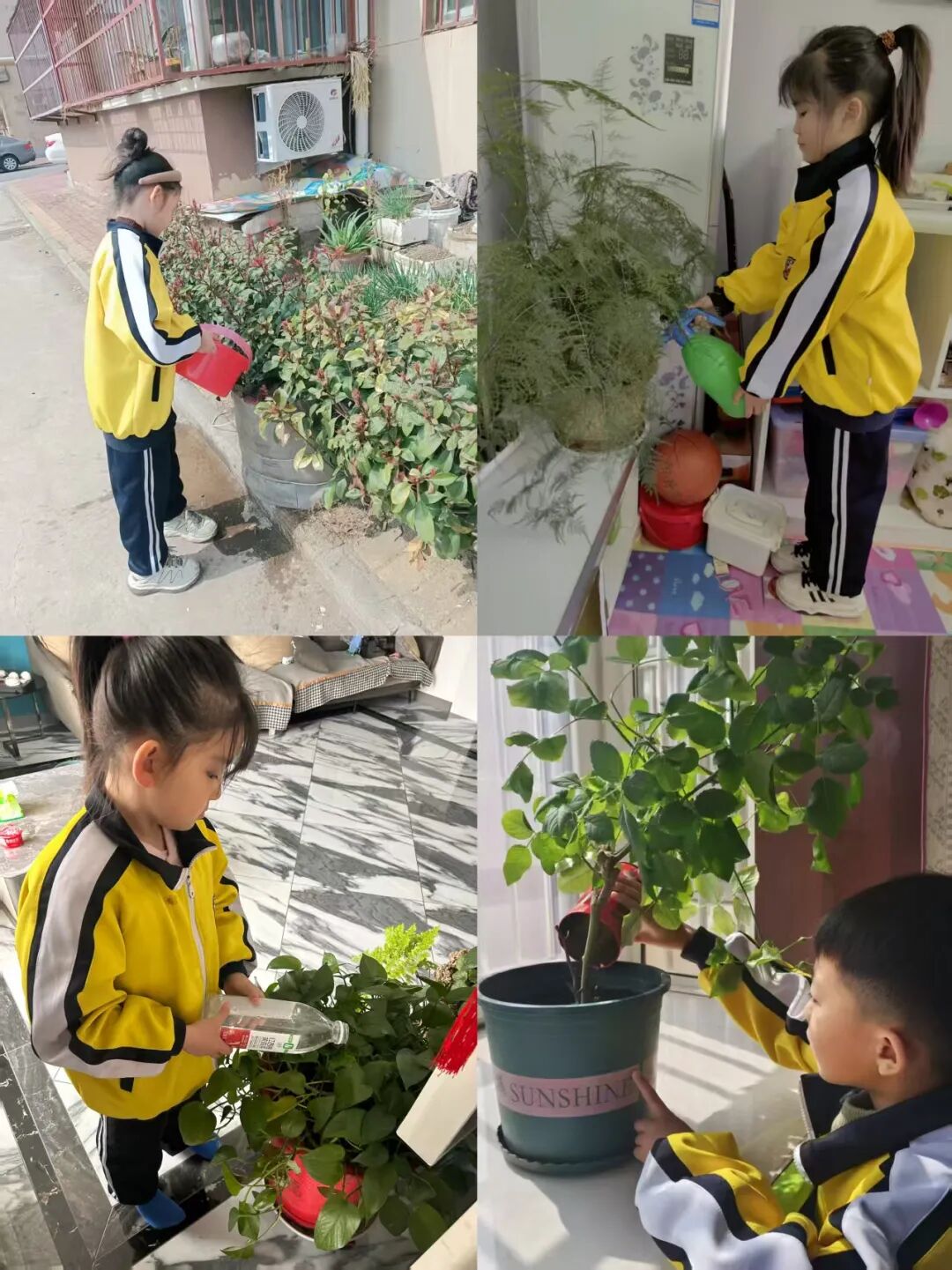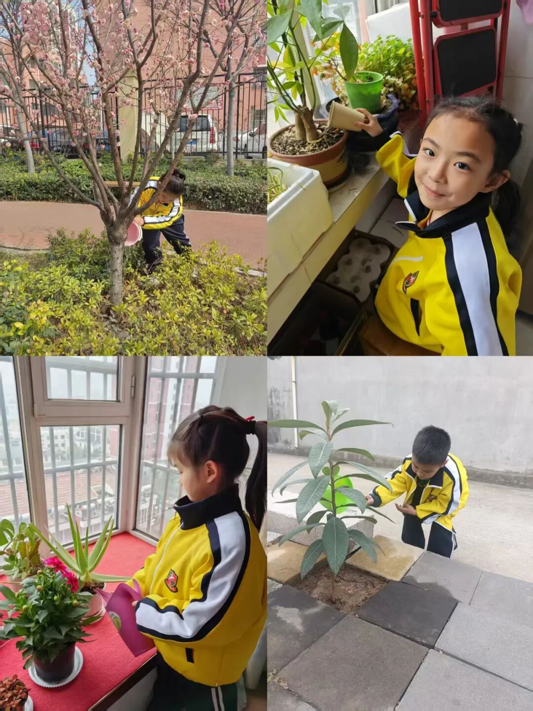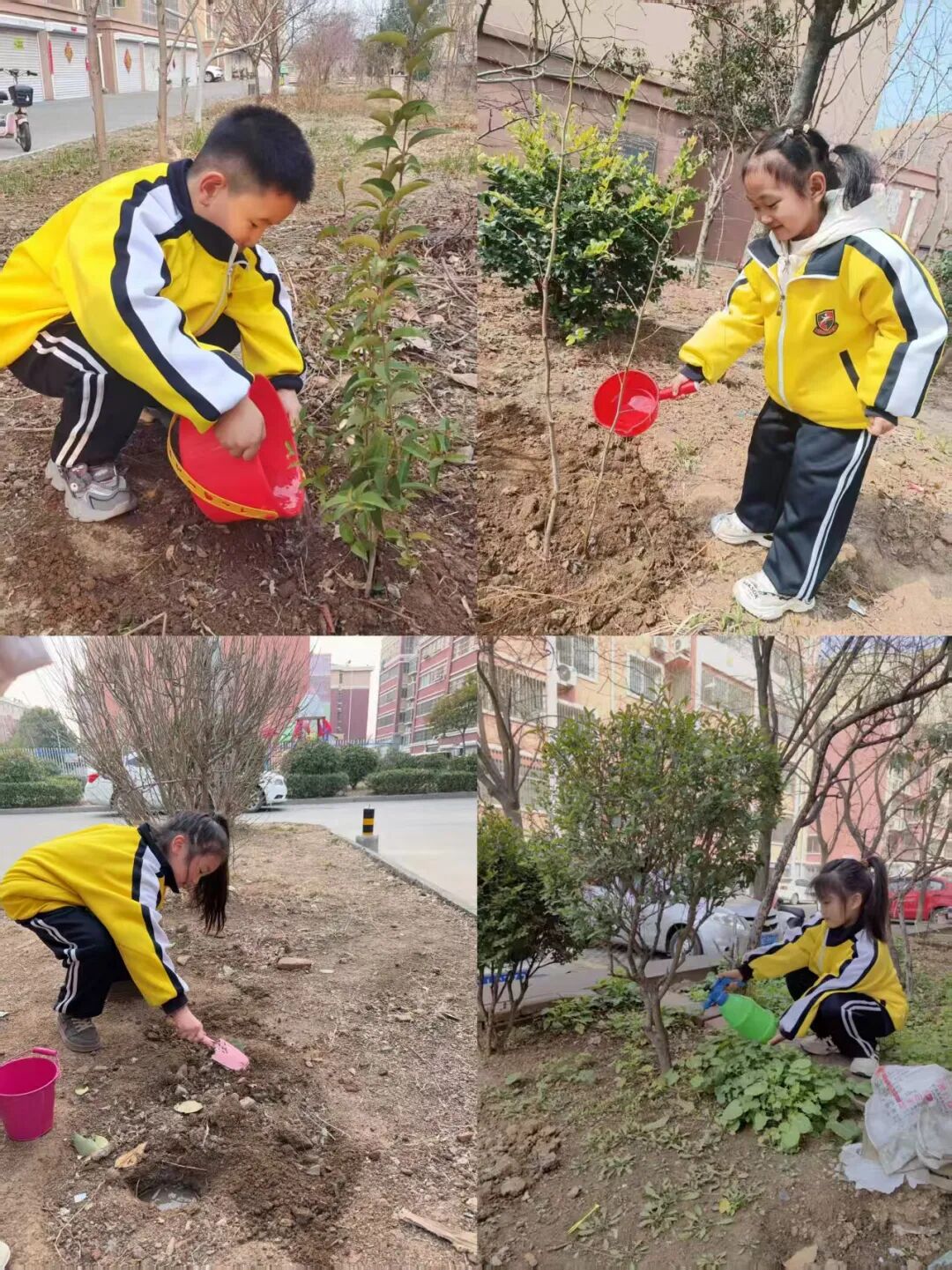 一年级小同学们走出家门来到户外,挖坑、培土、浇水,积极地参与到植树节活动中。孩子们兴奋地约定“每天都来照顾我的植物朋友”。
