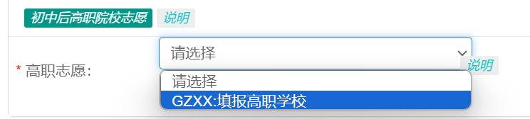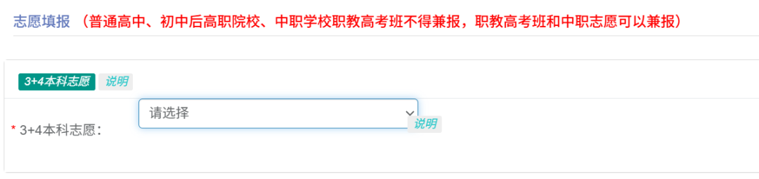 3.根据个人情况选择个人志愿信息。注意:3+4本科志愿可以与任一批次志愿兼报,普通高中、初中后高职院校、中职学校职教高考班不得兼报,职教高考班和中职志愿可以兼报。艺体特长生在第一志愿填报艺体学校时,需填写对应学校的艺体测试考号。
