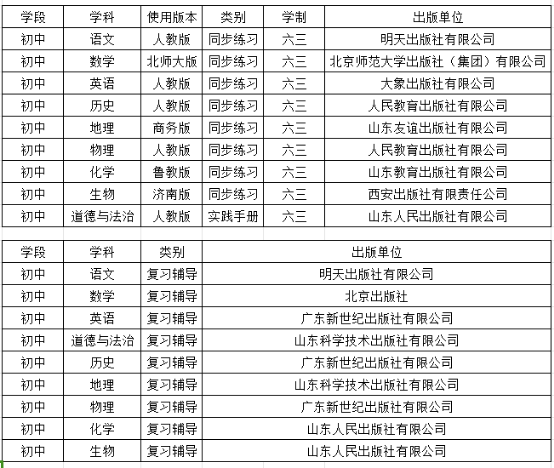 【教材教辅】枣庄十五中南校(勤为学校)教辅选用目录