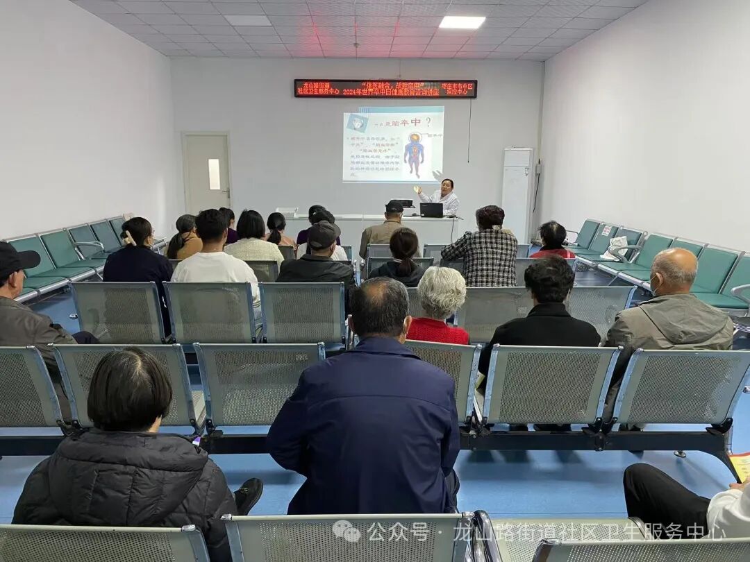 2024年10月29日是第19个“世界卒中日”,为进一步提高居民对脑卒中的认识和关注,实现脑卒中的早预防、早识别、早救治,动员全社会关注脑卒中,今日下午,龙山路街道社区卫生服务中心联合市中区疾病预防控制中心开展了以“体医融合,战胜卒中”为主题的健康科普知识讲座。