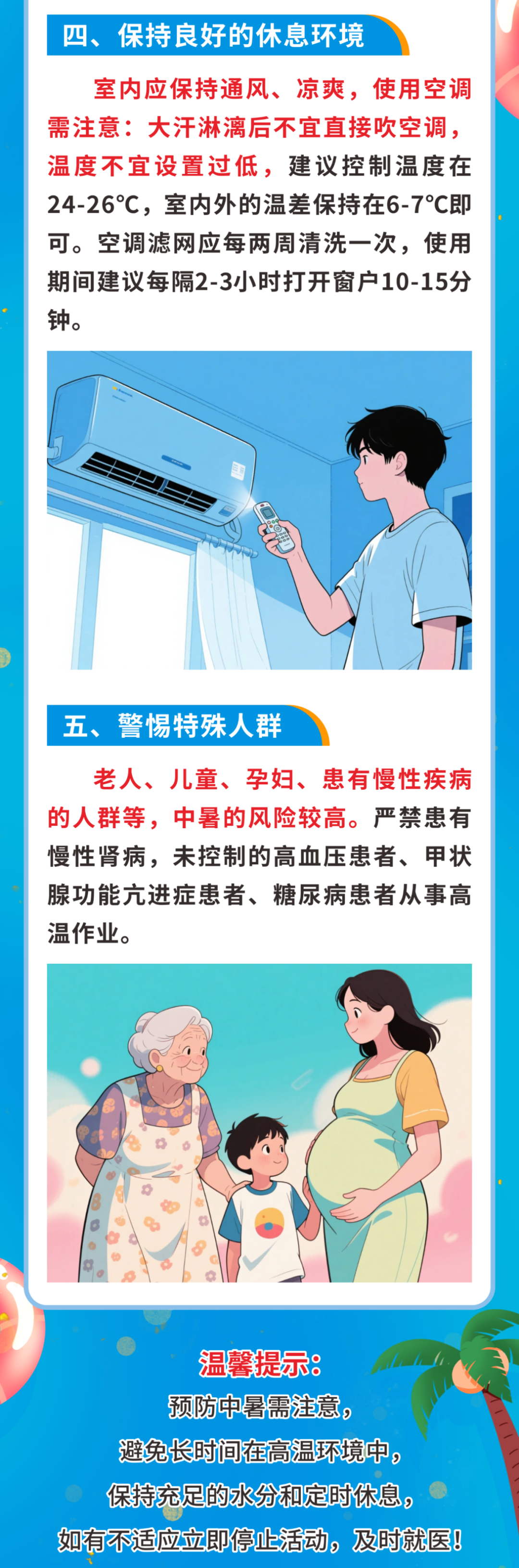 3.老年群体:老年人因体温调节能力下降成为重点防护对象。独居老人夏季空调温度建议设定在26-28℃,心脑血管疾病患者需要加强血压监测,避免高温诱发脑卒中。
