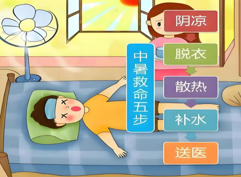 要迅速将患者转移至阴凉处,用冷水、风扇等进行降温散热处理。