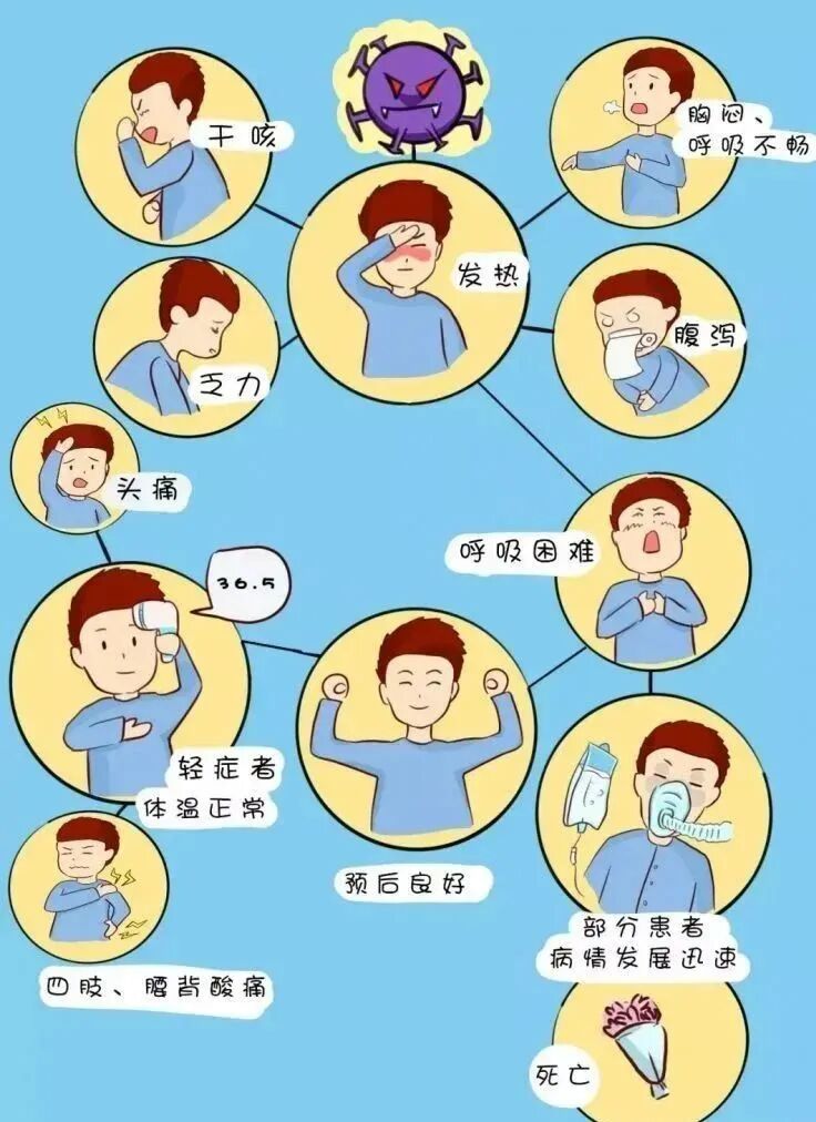 主要表现为咽干、咽痛、咳嗽、发热等,发热多为中低热,部分病例亦可表现为高热,热程多不超过3 天;部分患者可伴有肌肉酸痛、嗅觉味觉减退或丧失、鼻塞、流涕、腹泻、结膜炎等。少数患者病情继续发展,发热持续,并出现肺炎相关表现。重症患者多在发病5~7 天后出现呼吸困难和(或)低氧血症。严重者可快速进展为急性呼吸窘迫综合征、脓毒症休克、难以纠正的代谢性酸中毒和出凝血功能障碍及多器官功能衰竭等。极少数患者还可有中枢神经系统受累等表现。