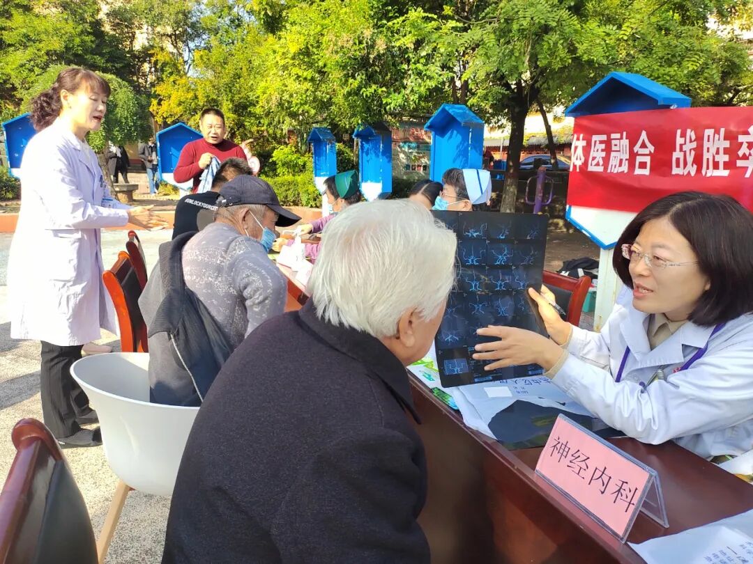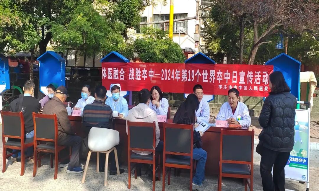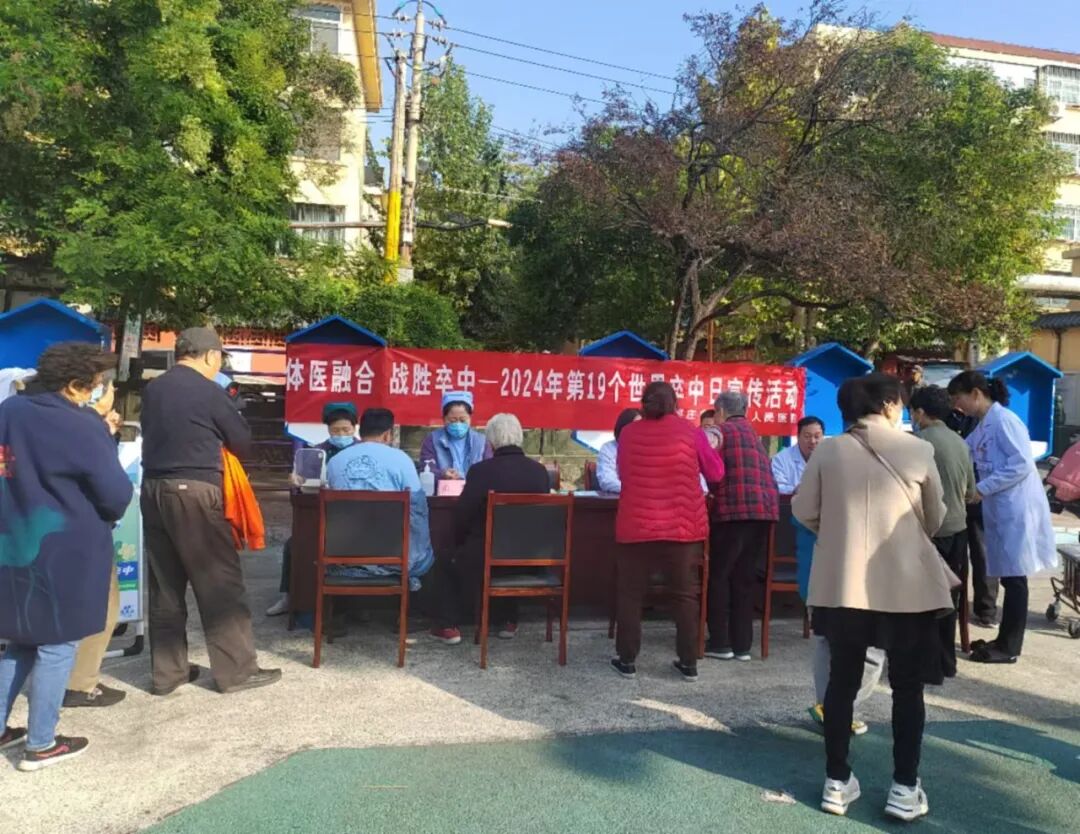 2024年10月29日是第19个“世界卒中日”,今年宣传主题是“体医融合,战胜卒中”。为了提高居民对卒中的早期识别,倡导通过科学运动预防卒中发生,树立“运动是良医”的健康理念,10月28日,我院组织神经内科、神经外科、急诊科、康复中心、公卫办等多科室医务人员走进中心街街道薛庄社区党群服务中心进行宣传义诊活动。